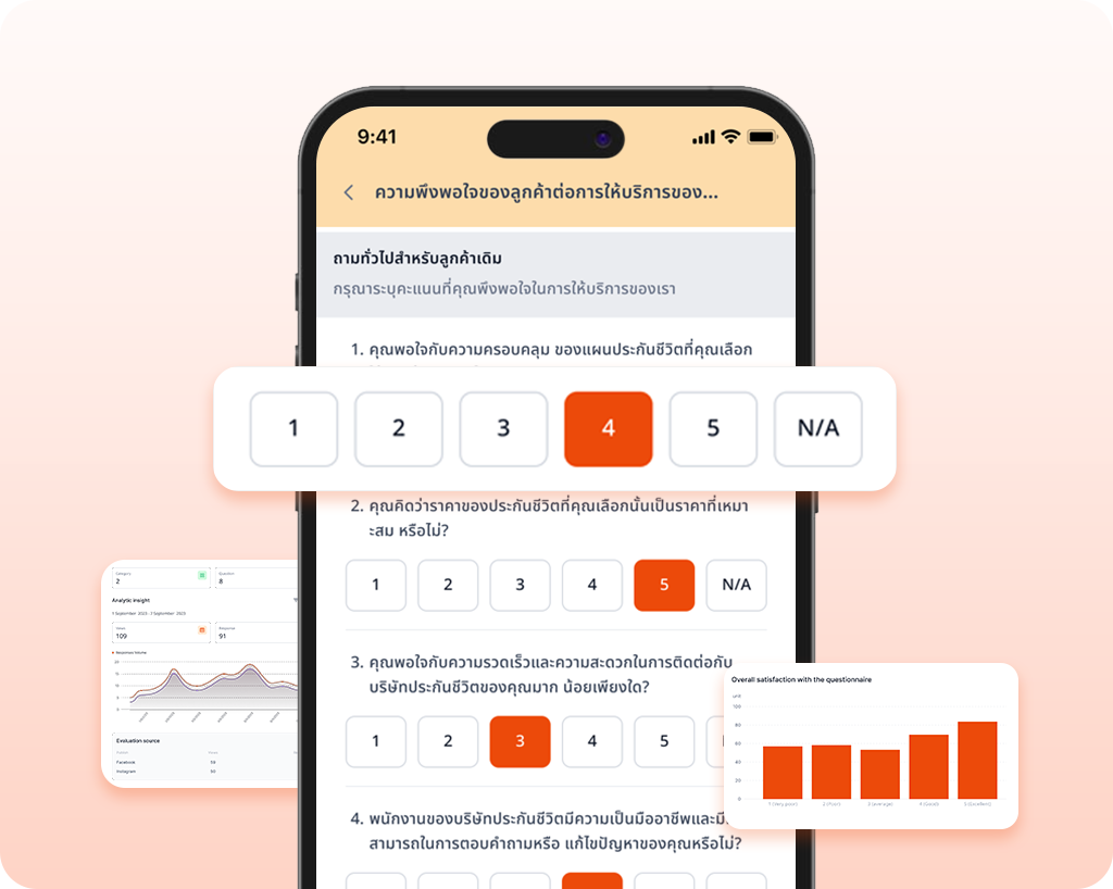 รองรับคำถามหลายรูปแบบ เช่น Multiple Choice, Rating Scale, Score, Free Text, วันที่และเวลา รวมถึงคำถามเชิงประเมินคุณภาพบริการ รองรับทั้งข้อมูลเชิงปริมาณและเชิงคุณภาพในแบบฟอร์มเดียว ช่วยให้สามารถวิเคราะห์ข้อมูลได้ลึกและแม่นยำมากขึ้นรองรับทั้งข้อมูลเชิงปริมาณ (Quantitative) และเชิงคุณภาพ (Qualitative) ในแบบฟอร์มเดียว