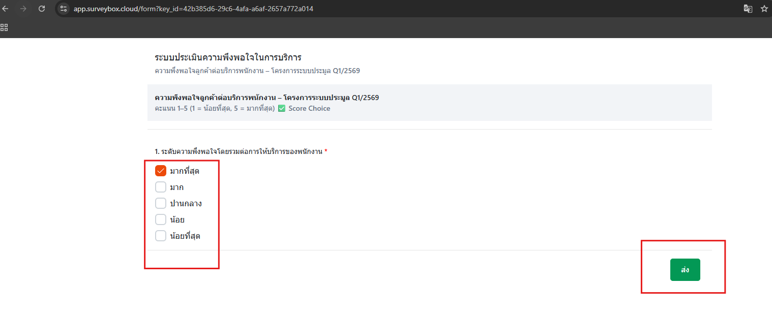 - เมื่อผู้ตอบแบบสำรวจได้เข้าถึงลิงค์แล้ว ให้ทำการตอบแบบสำรวจให้ครบ จากนั้นคลิกปุ่ม ” ส่ง ”